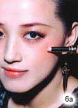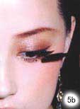 5.深金棕色眼影棒抹在下眼睑尾部呼应整体眼妆色彩。涂上浓密睫毛膏,反复仔细地刷上2~3层制造丰盈的睫毛效果。