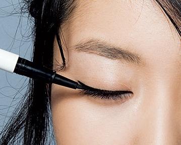 3.眼线液必不可少,黑色眼线液最能使眼睛看起来明亮。从眼头到眼尾,沿睫毛根部描画。