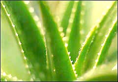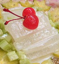 2.把芦荟叶肉取出,在开水中煮烧3~5分钟,捞出,切10克芦荟叶肉成丁块,铺在番茄上。