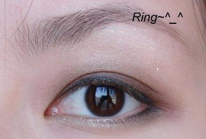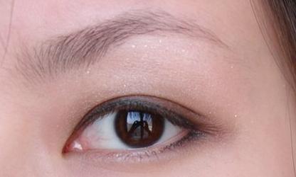 再用金色少量多次压在咖啡色上面,然后用中号眼影刷将颜色过度 用眼线笔化整条上眼线 结束的位置在最后一根睫毛处