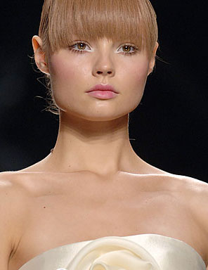 1、选择哑光粉底、珠光白眼影,于眼睑平涂棕色眼影,淡描轮廓,描画细致眼线,涂出根根分明的纤细睫毛。