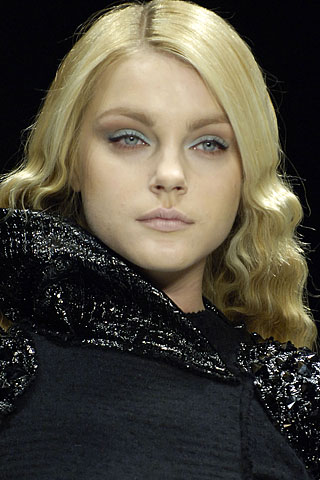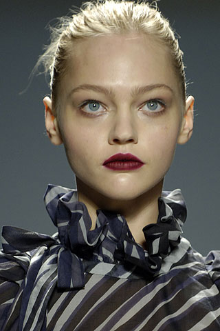 深红色的哑光质地唇膏涂满了模特的嘴唇,锁住了注视的目光,与素净的裸妆脸庞共同诠释了都市女性典雅又不失坚强的一面。长久以来,Peter Som始终如一地秉承着雅致、简约、迷人、奢华、无拘无束的理念,以其自然典雅、精致性感的美学意境给现代时尚带来了美的享受。