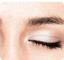 STEP 1 清新自然的裸眼妆,画法很简单,先用大眼影刷沾双色眼影(薰香紫光)中的银白色, 刷满整个眼窝与眼头ㄑ型部位,双眼立即闪亮放大!接着沾另一盒珍珠粉红的粉红色从眼尾以“ ㄑ型”倒勾回刷,勾勒出内敛甜美的妆效。