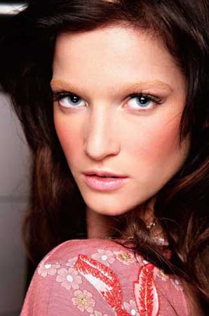 先将较淡的粉红色涂匀整个眼窝位,如涂搽的眼影为cream状的话,涂搽前最好不要加碎粉。用浅珠光色系眼影打底,再涂粉色,既有粉的轻柔,又有珠光的魅惑。最重要的是,这样不会让眼睛看起来浮肿。之后将较深的粉红色眼影涂于双眼皮位置,以增强眼部的立体感。然后,再画上深啡色的上眼线。从颧骨以下的位置打斜扫上粉红色胭脂至耳朵前。涂上较重的浓密睫毛液,以增强眼部神采,也有助改善眼肿的视觉效果。 以较红润的唇膏衬托粉红色眼影,以免显得呆板,最后加上带shimmer效果的lipgloss。 |