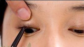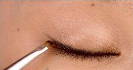 步骤2、用细的平刷取黑色的眼影在紧靠睫毛的上方描绘出黑色的线体,到眼角处要流畅自然的向上提升。