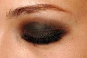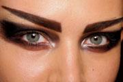 将深色眼影,从眼睑延伸至眼角,呈三角形向外拉长。这时最好选择黑色或者是深铁灰色这样的颜色。再用莹白色眼影强调内眼角,强烈的视觉对比和几何造型,让迷离的眼妆中透露出后现代的气息。