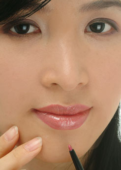 Step1:轻柔的以左右来回的手法,描绘出浅浅的模糊唇线,嘴唇显得自然丰润。