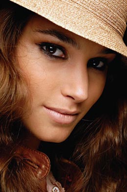 从最黑的近睫毛处的眼线到眉骨之间的过度非常自然,要很明显地呈现出灰度渐变的多个色带。睫毛使用浓密纤维睫毛膏厚厚地涂上三层,便能使迷人的效果增强。 |