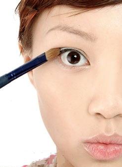 用眼影刷粘深色眼影粉涂在眼皮褶的部位。加深眼褶的凹陷感,让眼皮褶更加自然化。