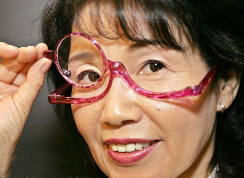 10月18日,在日本东京举行的一年一度国际光学仪器展上,日本眼镜制造商Volks的雇员在展示一款特殊的化妆眼镜。这种眼镜有一枚可以左右转动的镜片,专为视力不好的人化妆使用。人们可以一只眼睛戴着眼镜为另外一只眼睛化妆。这款眼镜售价为2000日元(约合18美元)。