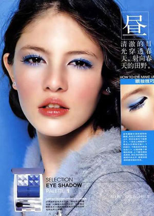 这款蓝色迷朦眼妆,上眼睑以蓝色晕开,下眼睑以浅紫色晕开。比较适合五官欧化的女人。蓝紫色本来就很适合打造深邃的眼睛,媚颜美人计的最佳妆容。