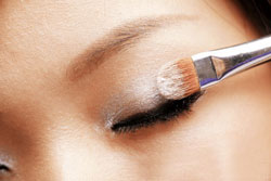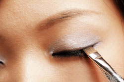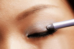 ↑沿着睫毛边缘,用扁头刷子描绘深灰黑色眼影。