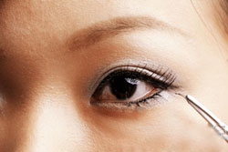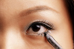 ↑眼睛向上看,用黑色眼线笔描绘下眼皮的眼尾。