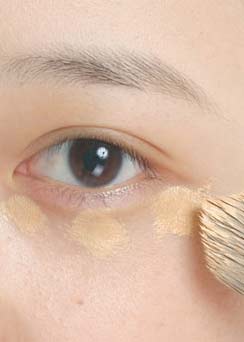 在自然光线下,用小号遮瑕刷蘸取遮瑕霜,在黑眼圈部位从内眼角向外涂抹,接着用指腹在边界处轻轻揉匀,如有需要可重复再涂一次。