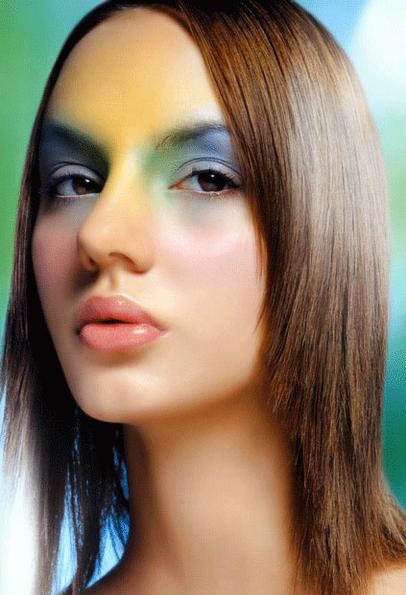 眼睑:在上眼皮外侧大面积扫蓝紫色,在上眼睑内眼角处用荧光绿色衔接,然后用眼线刷或手指轻轻晕开,与眼睑处的颜色衔接自然,在下眼睑用粉紫色涂得越接近睫毛越好,之后用棉签晕开。