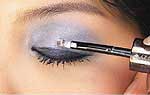 a、以霜状带有银粉质地的眼影大幅在眼窝部分打底,让眼神更显明亮,可以用指腹晕出漂亮的渐层色彩。
