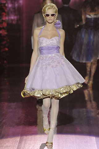 美国“老甜甜”Betsey Johnson从来不曾因为自己的年龄终止过对于少女的向往。这次以Betsey 1958年时高中“Promo”(毕业舞会)为主题的系列,一如既往的性感可爱,金发碧眼的性感尤物依旧是设计师的缪斯女神。整个秀场被布置成了一个巨大的舞池,女生们身穿层层叠叠的薄纱蓬裙或是帝国式的高腰裙,搭配白色的丝袜,像是一个个粉嫩可爱的芭比娃娃。花朵,蕾丝,蝴蝶结的装饰几乎泛滥,却也原始地表达出了少女的审美情趣。泳衣的设计则像极了梦露时代的招贴画女郎……不过,最有Betsey特色的还是那件黑底白点小礼裙,硕大的黑色蝴蝶结,让人联想起米奇那对圆形耳朵。