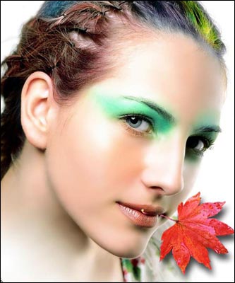 将颜色聚集到眼部,其化妆的效果让人惊艳。用强珠光的白色眼影涂抹从内眼角开始大约1/3的上下眼睑。在上眼皮刷在从眼梢到眼窝的区域里反复刷上绿色眼影,并晕开制造出颜色渐变的效果。