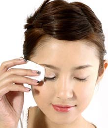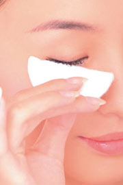 2、闭上眼睛,将一片化妆棉敷于眼睑,约三秒从上至下开始擦拭。重复此步骤二至三次,便可完全卸除眼影及睫毛膏。