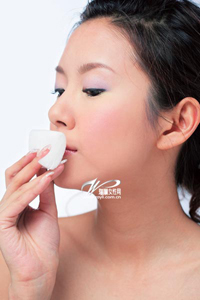 5、卸除口红时,同样敷于唇上三秒,然后由嘴角向中央擦拭卸除。