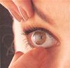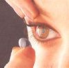 清洁双手后,将镜片放在食指指尖上,注意正面朝上(参见右图)双眼注视前方,双手中指将上下眼睑拉开,然后将镜片附着于角膜中,然后移开食指再往下看以使镜片附着于眼睛上,双手中指徐徐放松眼皮。