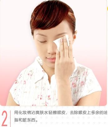 第一步:用化妆棉沾化妆水轻轻擦眼皮,干净的眼皮才有变身的资格