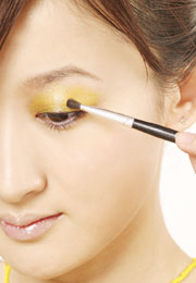 3、将眼影膏或唇油涂在眼影粉上面,注意:油脂的纯彩或眼影膏很容易花妆,要及时补妆。
