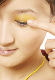1、先把鲜亮颜色的眼影粉均匀地涂抹在上眼睑上。