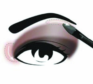 在眉骨下方涂上高光颜色,内双和单眼皮再在内眼角处贴合眼角形状突出弧形高光部分。