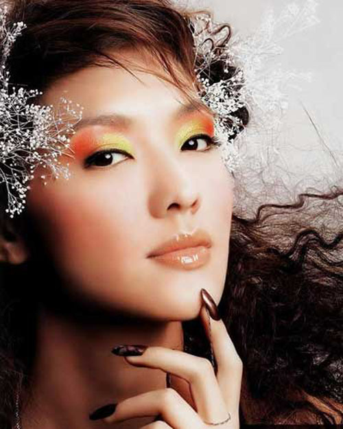 明亮欢愉的醇正橘红眼影,搭配提亮眼角的淡鹅黄色,透出清澈纯真的美感,两颧大面积的桔色系腮红呼应了眼影的田园气氛,整体感觉清新可人。