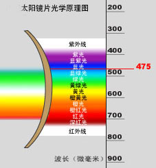 ● 波长在475微毫米以内的光是由蓝光(B)、紫光(V)和紫外光组成。这些光对人类的眼睛是有害的,会造成结膜炎、角膜炎、白内障、视网膜脱落等多种眼睛疾病。即便是市场上对有害光过滤效果最佳的太阳镜片也只能过滤掉波长在400微毫米以内的紫外光(U),既所谓“UV400”。