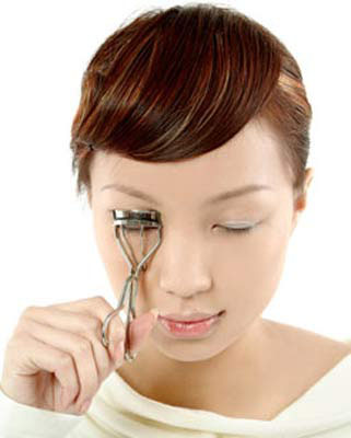 先用三段式夹法把睫毛夹出弧度以免和假睫毛的弧度不能融合夹不到的细节部分可以用小型局部专用睫毛夹