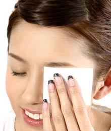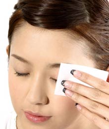 Step3滴一点卸妆液到化妆棉上然后闭上双眼依眼皮的肌理由眼头向眼尾方向慢慢抹去;抹下眼线位置时双眼向上望尽量避免过度拉伸眼部肌肤产生细纹