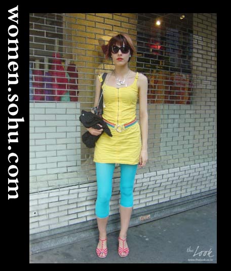 色彩明艳的搭配一定要恰到好处,不要超过三种颜色,否则给人太过眼花缭乱的感觉,这身黄,蓝为主色调,鞋与腰带的一点红色点缀其间,明亮活泼了许多。