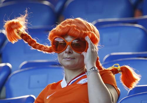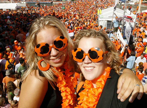 北京时间22日凌晨,2008年欧锦赛将迎来8强阶段的第3场比赛,荷兰将对阵俄罗斯。图为荷兰球迷的特色眼镜。