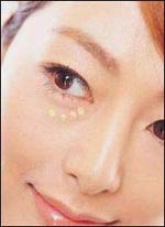 从黑眼圈轮廓往下点几个小点,黄色能修饰褐色调色素沉淀,往下以放射线朝外侧推开,让平常泛着黑眼圈的地方不再黑黑一块。