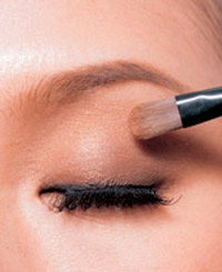 2.沾取带有光泽感的咖啡色眼影层迭于眼窝处,让眼型藉由深色眼影有放大效果。