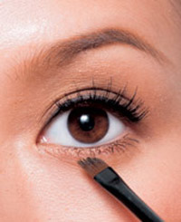 4.眼睛直视镜子,在瞳孔正下方开始着手,利用深咖啡色的眼线胶从中央画至眼尾。