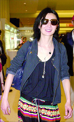 张曼玉的复古型太阳眼镜与民族花纹图案的裙子非常相配