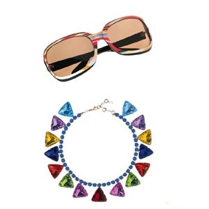 简单的方形太阳镜,亮点是周围彩色的镶边,配彩色三角形吊坠项链,看那些可爱的小三角,调皮的在你美丽的颈项排队~~热带美人!狂野不羁!