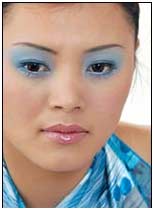化妆步骤:先用粉白色眼影在上眼睑至眉骨处打上淡淡的色彩,然后使用大块而浓重的蓝色眼影将眼睛四周的部位铺开。应当注意的是,千万不要吝惜蓝色眼影色块的使用,只管将眼影面积扩展,甚至大胆地延伸到眉弓与眼角至太阳穴处。最后用浓黑色眼线仔细勾画上下眼线,制造出夸张而协调的派对妆容。