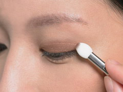 眼睛朝下看,在眼折处从眼头开始涂上霜状眼影,范围一直到眼尾即可,但是宽度不要超过双眼皮折线,确定发色度最强的眼影位置只在这个区域。