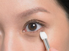 描绘时只用海绵头前端,将它立起来用前端一点点的面积来涂,才容易画得均匀。从距离眼头1/3位置的睫毛根部开始,先往后画、再从眼头画到此处。