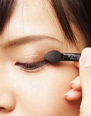先用浅色的咖啡色在眼窝处打底,再将较深的咖啡色画在眼尾的眼睫毛根部,并向眼皮中间和后眼窝位置晕染。