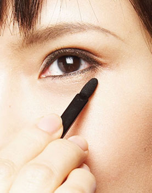 用黑色眼线笔在睫毛根部画出细细的上、下眼线,再在下眼尾用深咖啡色眼影稍微晕染;下眼头则用浅咖啡色。