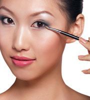 提示:贴双眼皮贴纸时,在眼头起始处贴近眼线,而眼尾处则略为抬高,这样贴出的双眼皮效果更自然。