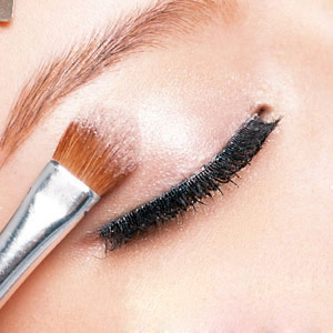 蓝色画起来容易脏,先让眼皮肤色明亮,才不会降低蓝色的色感;再用金色眼影迭上,眼头用线条式的打亮,眼窝则是大面积的刷上。