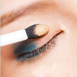 沾一点浅蓝色,从眼尾迭上后往眼头带,让蓝色可以自然的渐层到眼头。