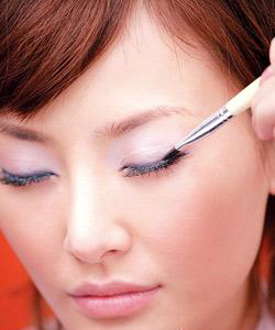 紧贴睫毛根部,用细眼影刷蘸眼影粉或用眼线笔勾画黑色眼线,避免颜色过深。