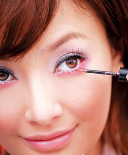 用细刷蘸闪粉,顺着下眼睑睫毛根部,从内向外点涂,线条一定要细。